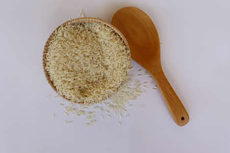 A long grain white rice, on rattan handmade bowl with wooden spoon isolated on white background. Copy space