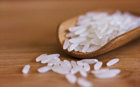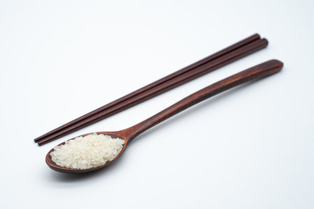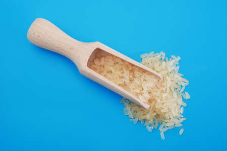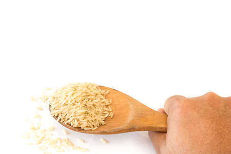 Uncooked rice in wooden spoon over white background. Close up, top view, high resolution product. Long-grain rice. The food is poor and starving