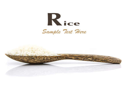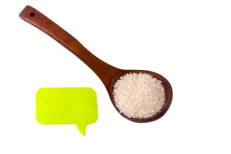 Raw organic rice in wooden spoon over white background. Sticker for inscription