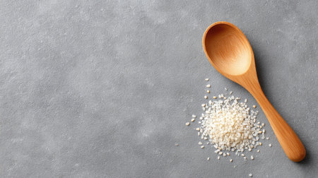 A close-up image featuring a pile of sea salt beside a smooth wooden spoon on a gray surface, ideal for culinary and food-related themes.