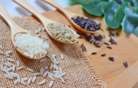 Various types of rice : Brown rice, Jasmine rice, Riceberry on old wooden background. Organic raw rice collection, Healthy food and diet concept, Selective focus.