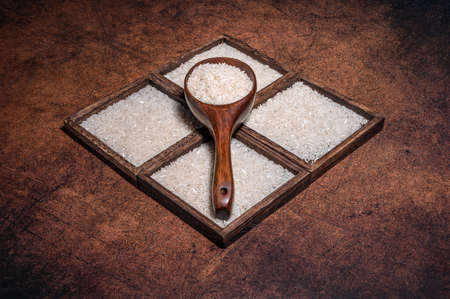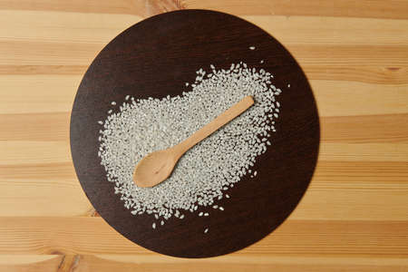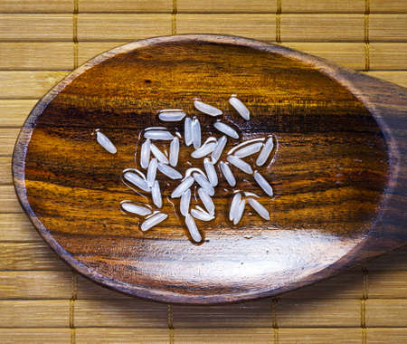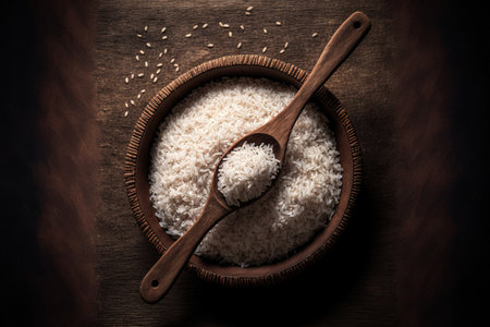 Natural diet strong in protein top view of wooden spoon with rice on rice in wooden bowl on rice and backdrop