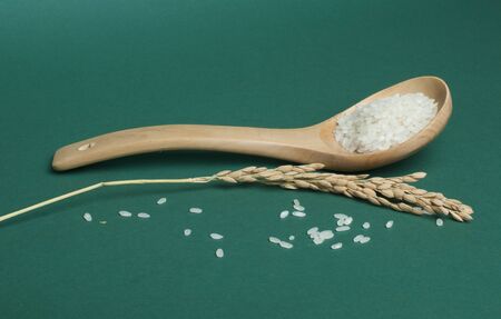 Raw Jasmine Rice in wooden spoon and the ears of rice rests on the old wooden floor in the top view. Thai grain production, a staple food for Asian people
