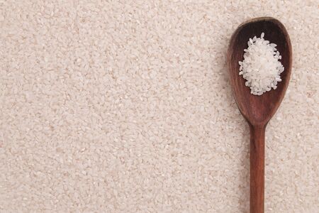 Raw white rice in a wooden spoon. Selective focus. background of round white rice on the plane.
