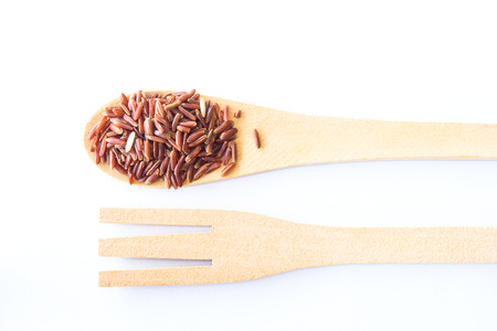 Brown or coarse rice, rice seeds, and a wooden spoon or fork. looking up
