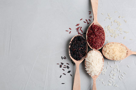 Flat lay composition with brown and other types of rice in wooden spoons on gray background. Space for text