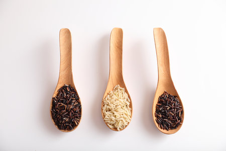 Dry organic white rice seeds in light brown wooden spoon with blur red, brown, and riceberry seeds on white background with copy space