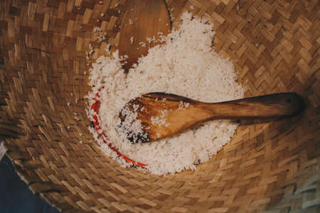 Steamed white rice on woven bamboo. Traditional place to keep rice in Indonesia