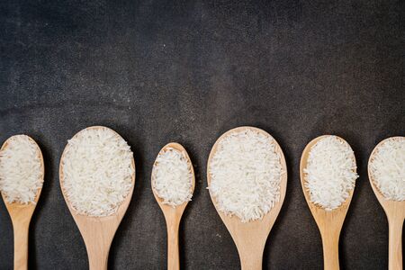 Close up of Thai jasmine rice in a black spoon. It is a rice species that originated in Thailand. It smells like pandan leaves. It is the rice variety that makes Thai rice an export product known all over the world.