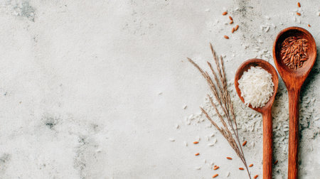 Rustic wooden spoons filled with rice and seeds, set on a textured gray surface. Perfect for culinary inspiration and healthy cooking concepts.