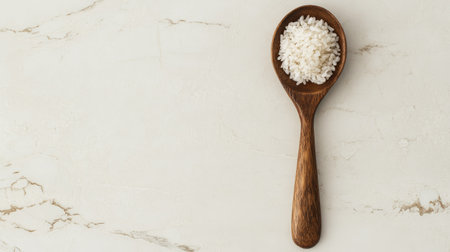 A wooden spoon filled with uncooked white rice is placed on a smooth marble surface, showcasing a simple and rustic kitchen ingredient perfect for culinary presentations.
