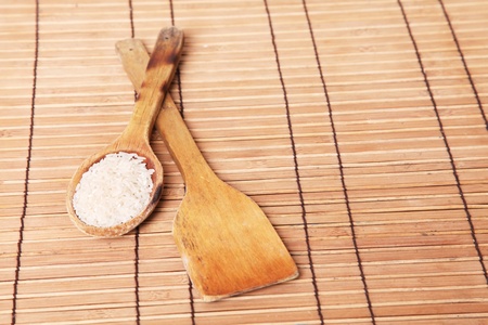 Wooden spoon with rice and wooden scoop empty over bamboo sticks background