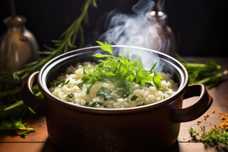 steaming pot with creamy risotto and herbs, created with generative ai