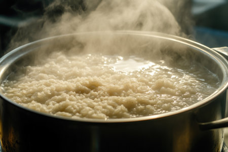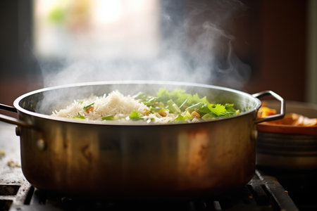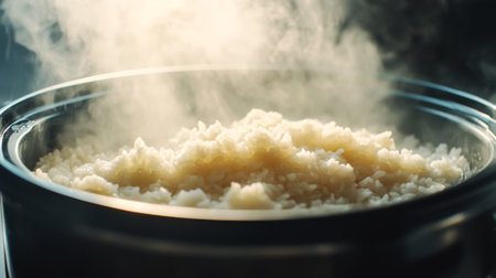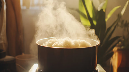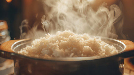 A close-up view of freshly cooked rice in a pot, surrounded by steam. This image captures the essence of home cooking and comfort food in a cozy kitchen setting.