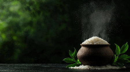 A serene image of white rice in a rustic clay pot, surrounded by vibrant green leaves and a delicate mist, perfect for capturing the essence of natural ingredients.