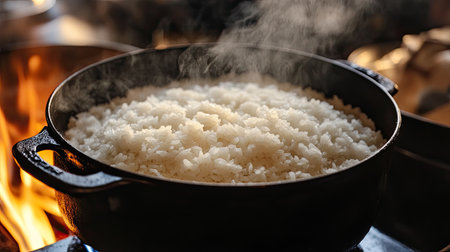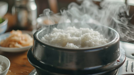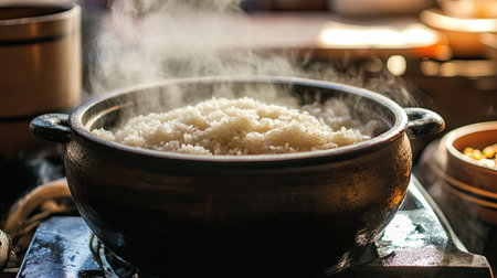 A steaming pot of rice sits on a rustic stove, radiating warmth and comfort. Ideal for showcasing culinary traditions and wholesome meals.
