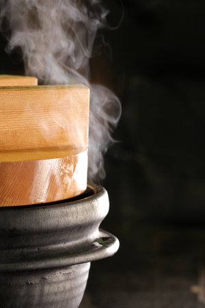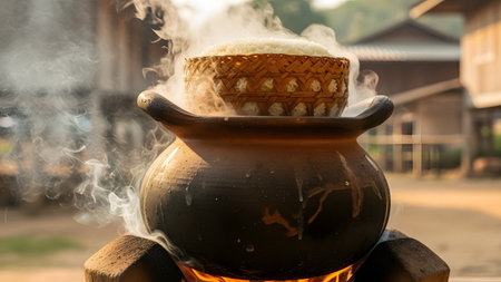 A captivating image showcasing steam rising from a basket of freshly cooked rice, surrounded by clay pots and a rustic kitchen atmosphere.
