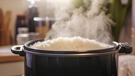 Warm steam escaping from an electric rice cooker filled with rice, lid open to reveal perfectly cooked grains, in a homely setting.