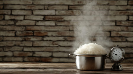 A steaming bowl of freshly cooked rice sits in a shiny pot on a rustic wooden table. A vintage timer adds a touch of nostalgia against the warm brick wall backdrop. Perfect for culinary themes!