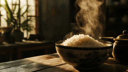 A steaming bowl of freshly cooked rice sits on a wooden table, emitting delicate wisps of steam. The warm ambiance and soft light create a cozy and inviting atmosphere.