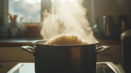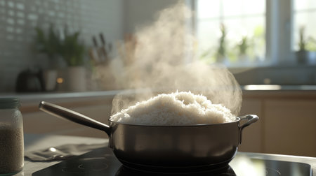 A pot of freshly cooked rice emits steam in a modern kitchen, showcasing the comforting and aromatic experience of home cooking. The scene captures the essence of meal preparation.