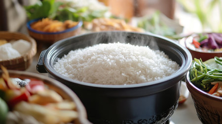 A steaming pot of freshly cooked white rice sits on a table, surrounded by vibrant ingredients ready for a delicious meal. Perfect for cooking enthusiasts.