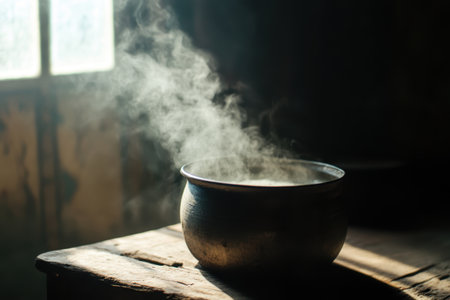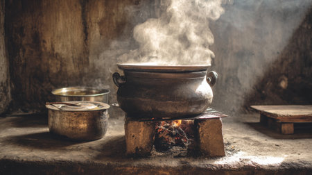 A traditional cooking pot emits steam over an open flame in a rustic kitchen, showcasing the essence of home cooking, heritage, and culinary craftsmanship.