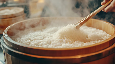 A steaming bowl of freshly cooked rice is displayed in a rustic wooden setting, showcasing the warmth and inviting atmosphere perfect for food lovers and culinary fans alike.