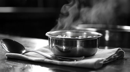 A steaming bowl of rice served on a cloth with a spoon, creating a warm and inviting ambiance. The monochrome effect enhances the elegant and simple nature of the dish.