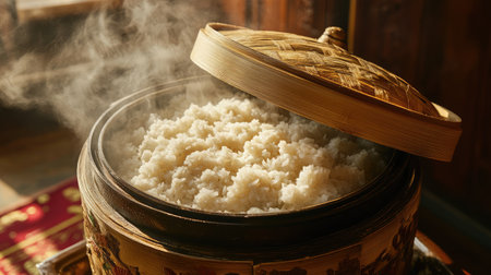 This image captures the traditional process of preparing sticky rice a staple food in Thai cuisine The scene depicts a rustic kitchen setting with a steaming bamboo basket filled with fluffy freshly