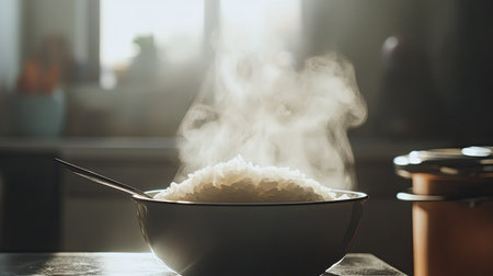 A steaming bowl of freshly cooked rice sits in a sunlit kitchen, radiating warmth and inviting aromas, showcasing the beauty of simple culinary art.