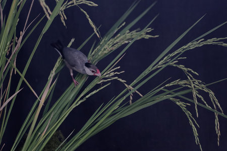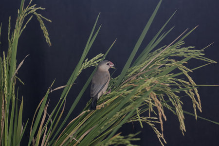 White-rumped Munia perching on grass stalk and feeding on its seeds