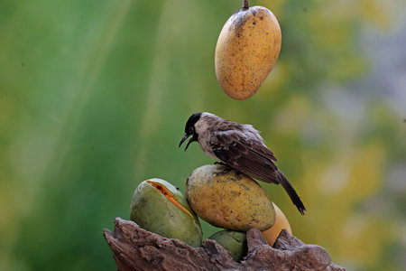 Black-crested Bulbul on the ground look for eat watermelon,Thailand