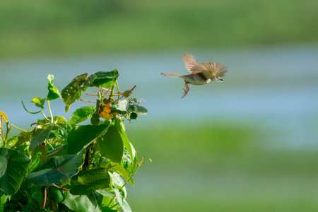 A flycatcher bird mid-flight, captured as it swoops down to catch its prey.