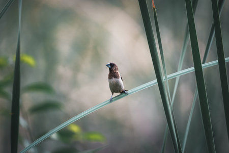 Scaly-Breasted Munia perching on grass, raising up head and looking into a distance