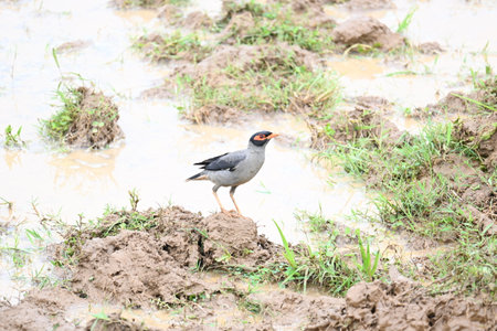 Indian Myna Birds in water filled field. It is searching for food in water filled mud. Its other names are Common myna and mynah. This is a bird of the starling family Sturnidae.