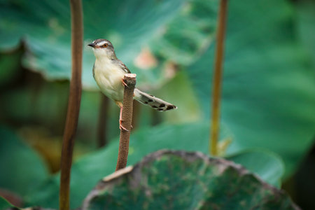 White-browed Prinia little bird perched on cockscomb pink flowers.