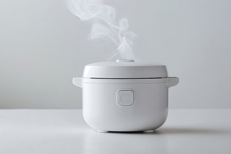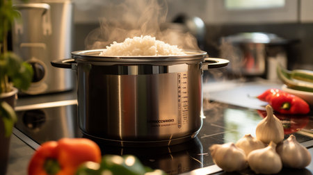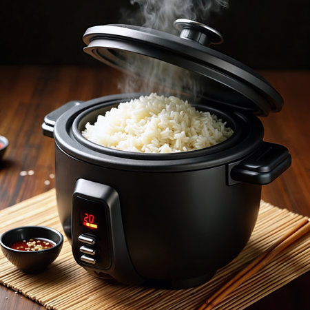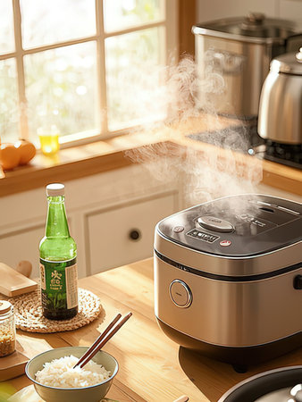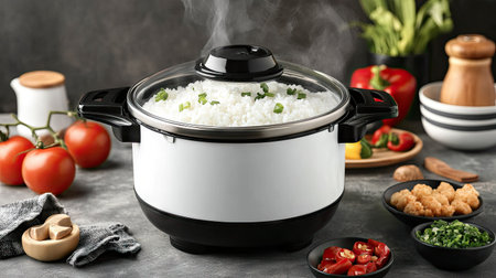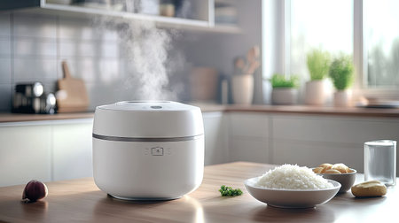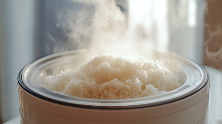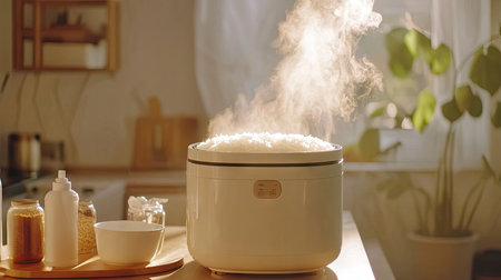 A modern rice cooker producing steam while cooking white rice. The scene captures the warmth and comfort of home dining with a delicious meal ready to serve.