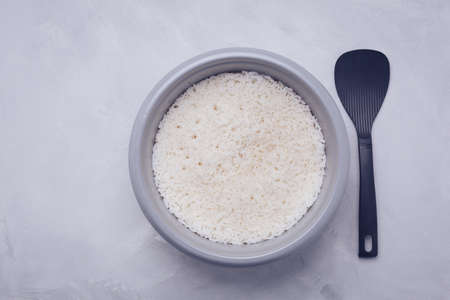 kitchen appliances and devices. Electric smart rice cooker on wooden counter-top in the kitchen with basmati rice, spoon with rice