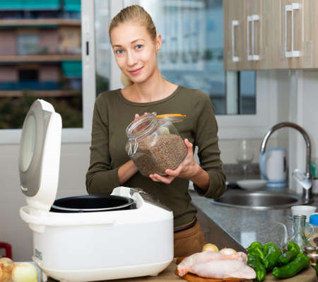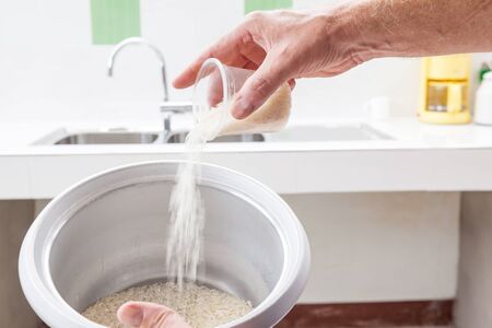 Housemaid pouring milled rice in electric rice cooker for dinner in the kitchen.