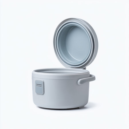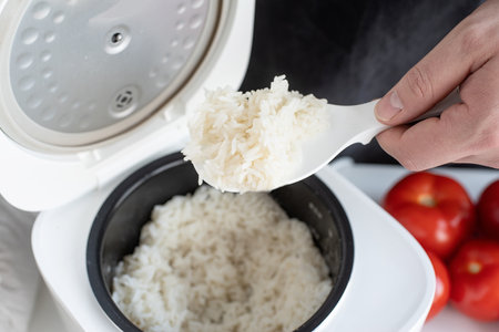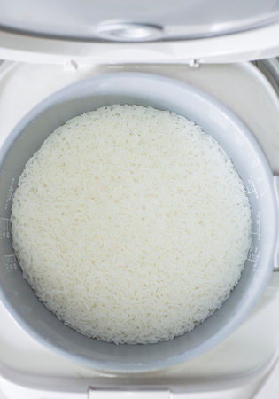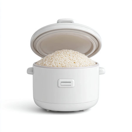 A modern rice cooker with an open lid revealing fluffy white rice inside. Ideal for easy cooking and meal preparation in any kitchen, perfect for families.