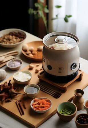 A stylish kitchen scene showcasing modern rice cookers alongside ingredients, emphasizing clean lines and a warm atmosphere for culinary inspiration.