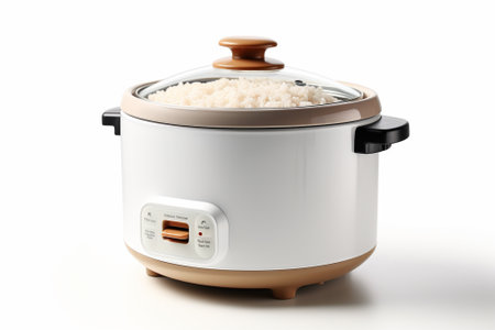 rice cooker with open lid, showing cooked rice, created with generative ai