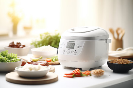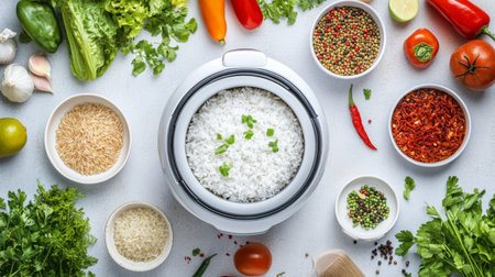 A vibrant display of fresh ingredients surrounding a rice cooker. Perfect for showcasing healthy cooking concepts, meal prep ideas, and culinary creativity.