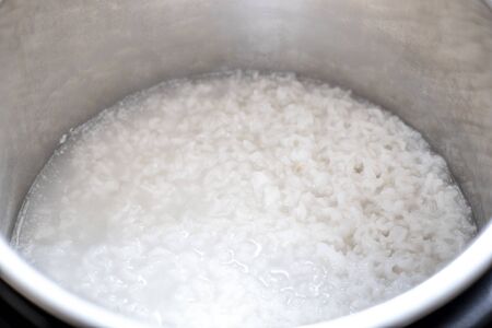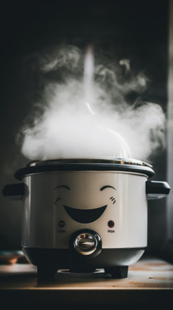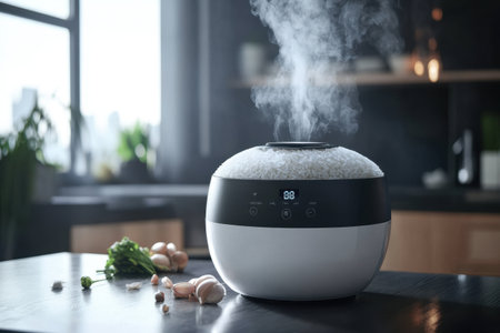 Smoke from the rice cooker, rice cooker in the kitchen, steam from the rice cooker, copy space for text.