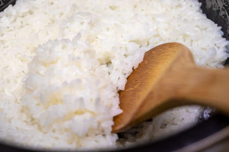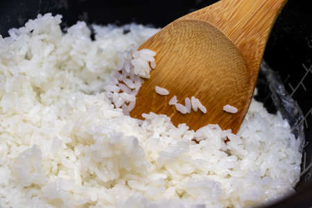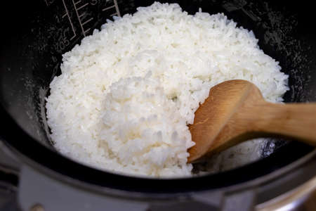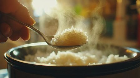 Close-up of a spoonful of hot steamed rice being served from a rice cooker, with fluffy grains and visible steam, symbolizing the comfort of a home-cooked meal.