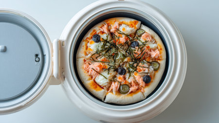 A delicious homemade pizza topped with savory ingredients sits inside a modern electric rice cooker, showcasing an innovative cooking method for flavorful meals.