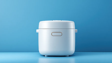 A white rice cooker is positioned on a smooth surface in front of a vibrant blue wall emphasizing its modern style.