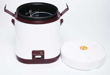 Modern white electric rice cooker is steaming on a white table against a neutral background