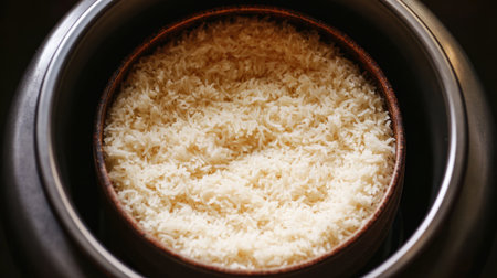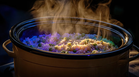 A steaming bowl of freshly cooked rice in a slow cooker, showcasing vibrant colors and soothing steam. Perfect for culinary inspiration and home cooking.